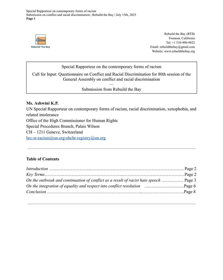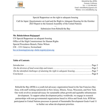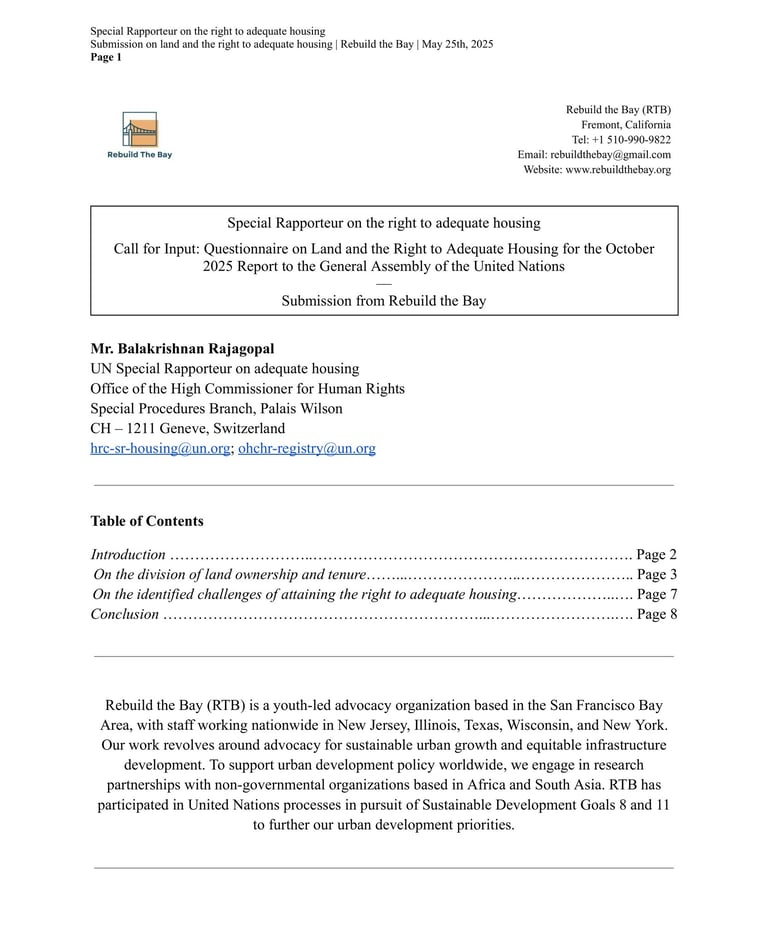 Rebuild the Bay authors submissions for United Nations bodies pertaining to Bay Area urban development concerns.