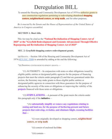 With lagging post-pandemic foot traffic, more than 3,000 abandoned strip malls take up large footprints in urban zones nationwide, limiting economic activity and decreasing surrounding property valuations. Our proposal authorizes grants to local jursdictions for the purpose of facilitating grayfield mall redevelopment into transit-oriented, mixed-use affordable housing; it promotes municipal deregulation via ministerial review and funds local fee and tax abatements for developers.